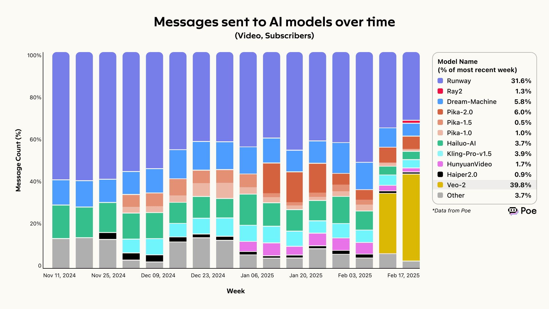 Google’s Veo-2, since its recent launch on Poe, rapidly captured nearly 40% of total video gen messages in just a few weeks